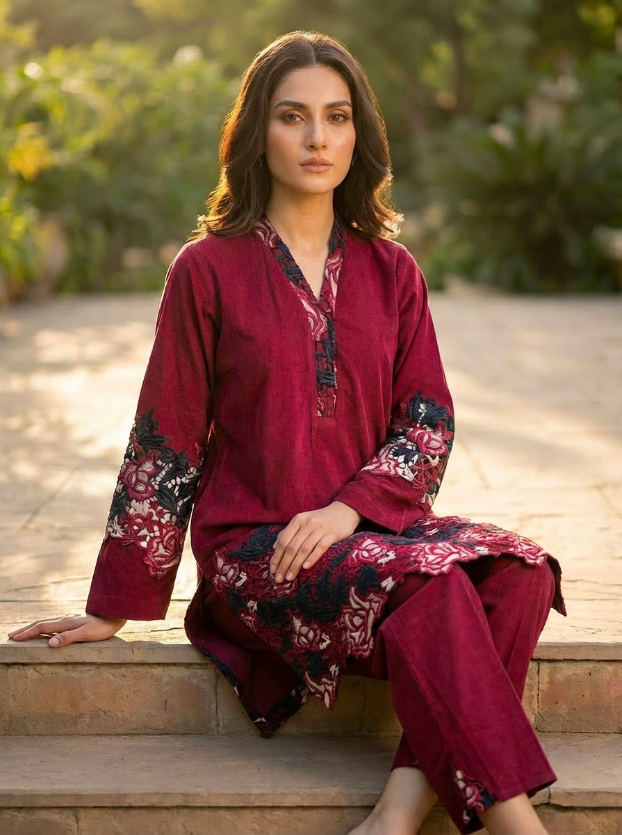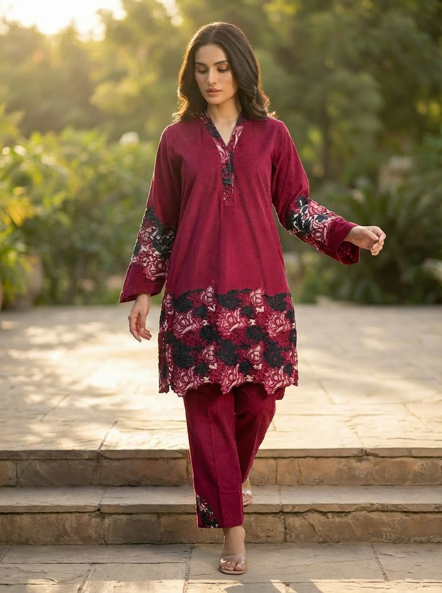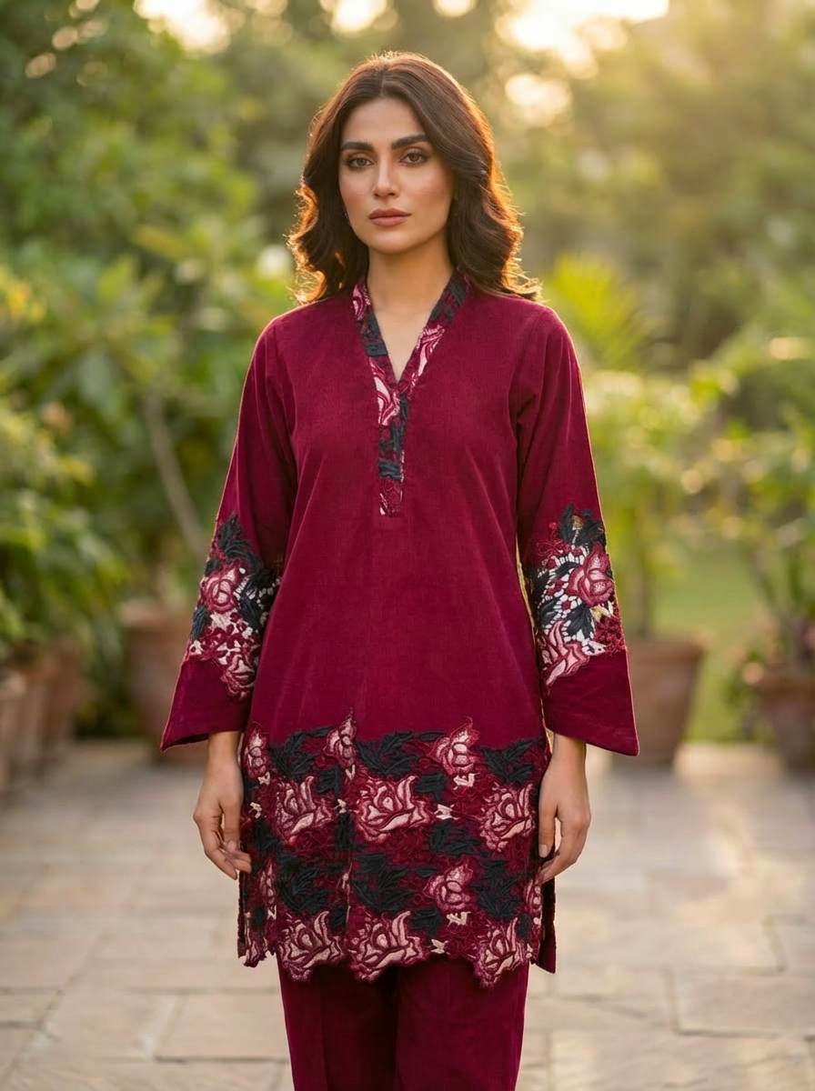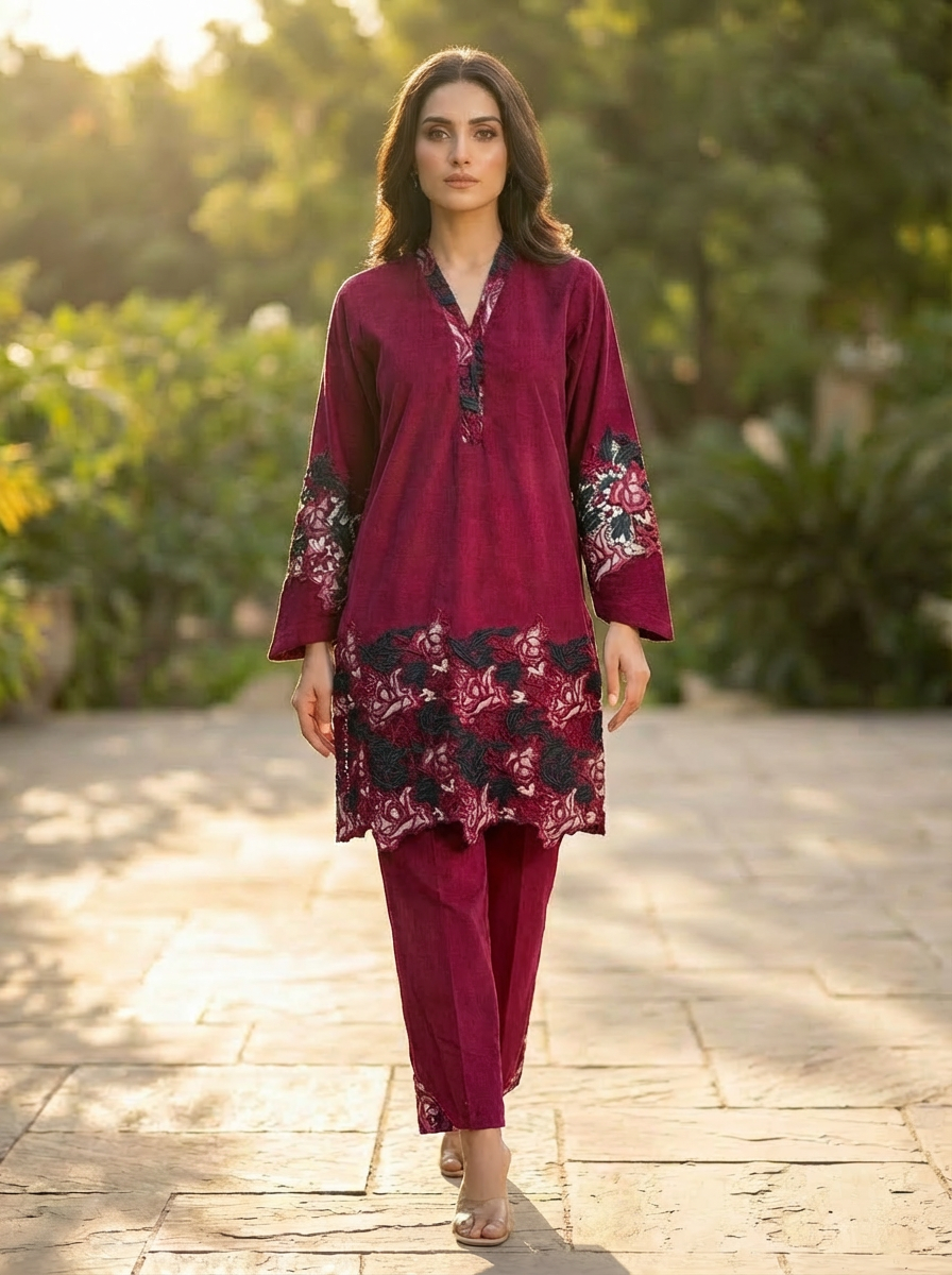 This stylish outfit is made from quality fabric and features quarter-length sleeves. The design is beautifully enhanced with detailed machine embroidery work, adding an elegant and refined touch to the overall look.