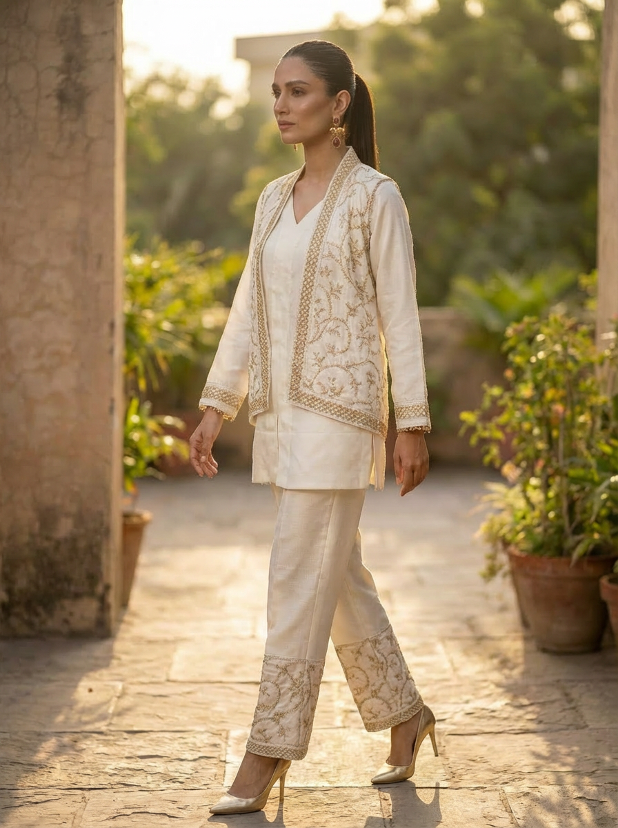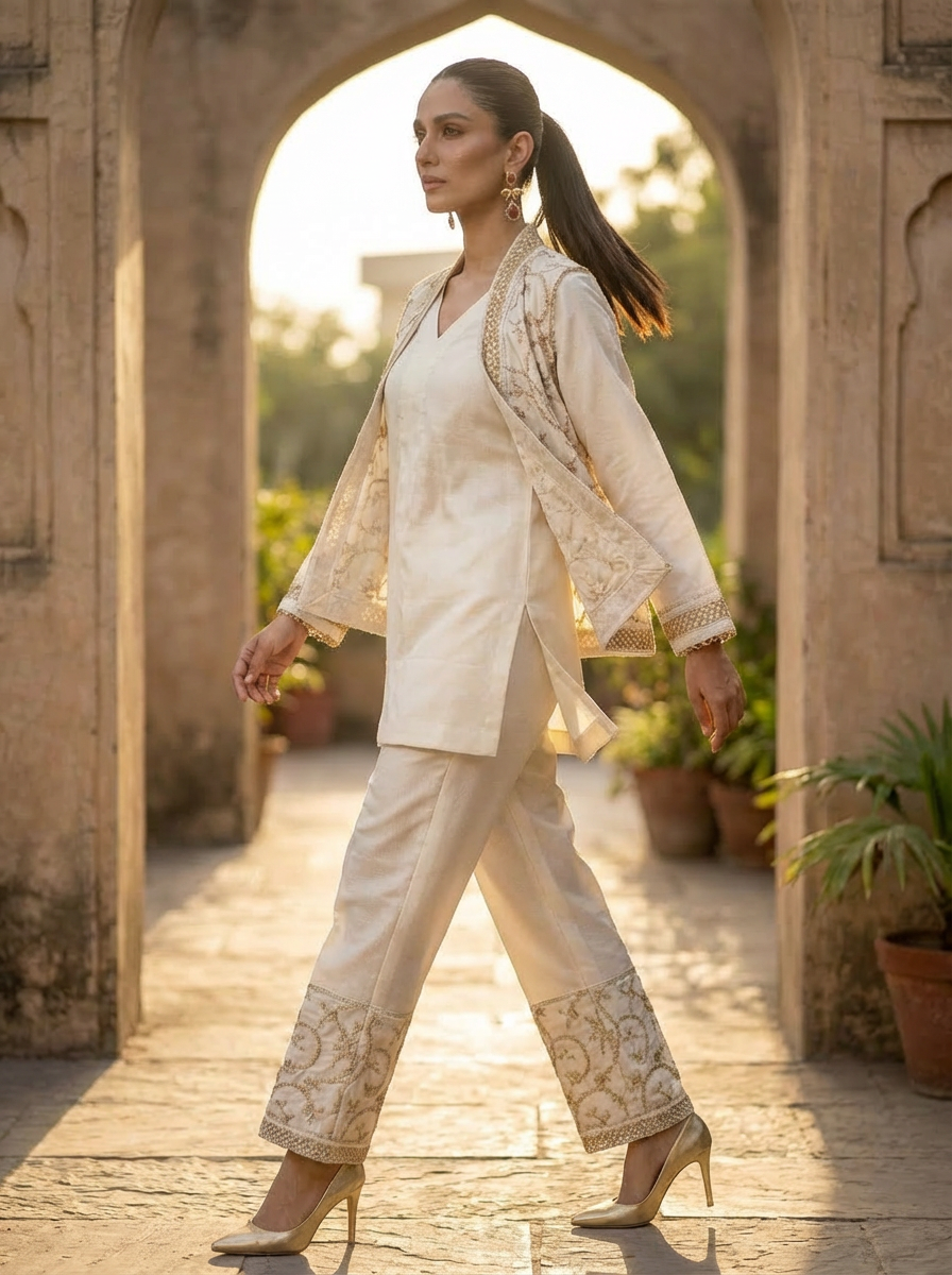 This outfit is crafted from premium Pashmina fabric, known for its soft texture, warmth, and luxurious feel. The design is beautifully enhanced with fine machine embroidery work, adding elegance and refinement to the overall look.