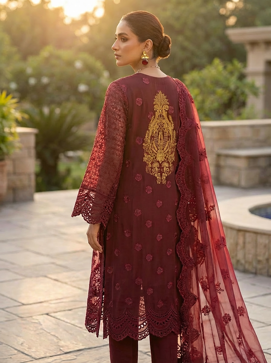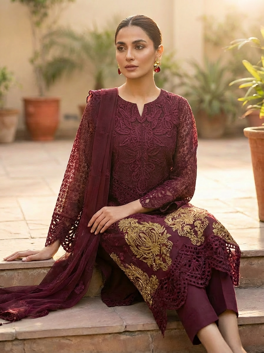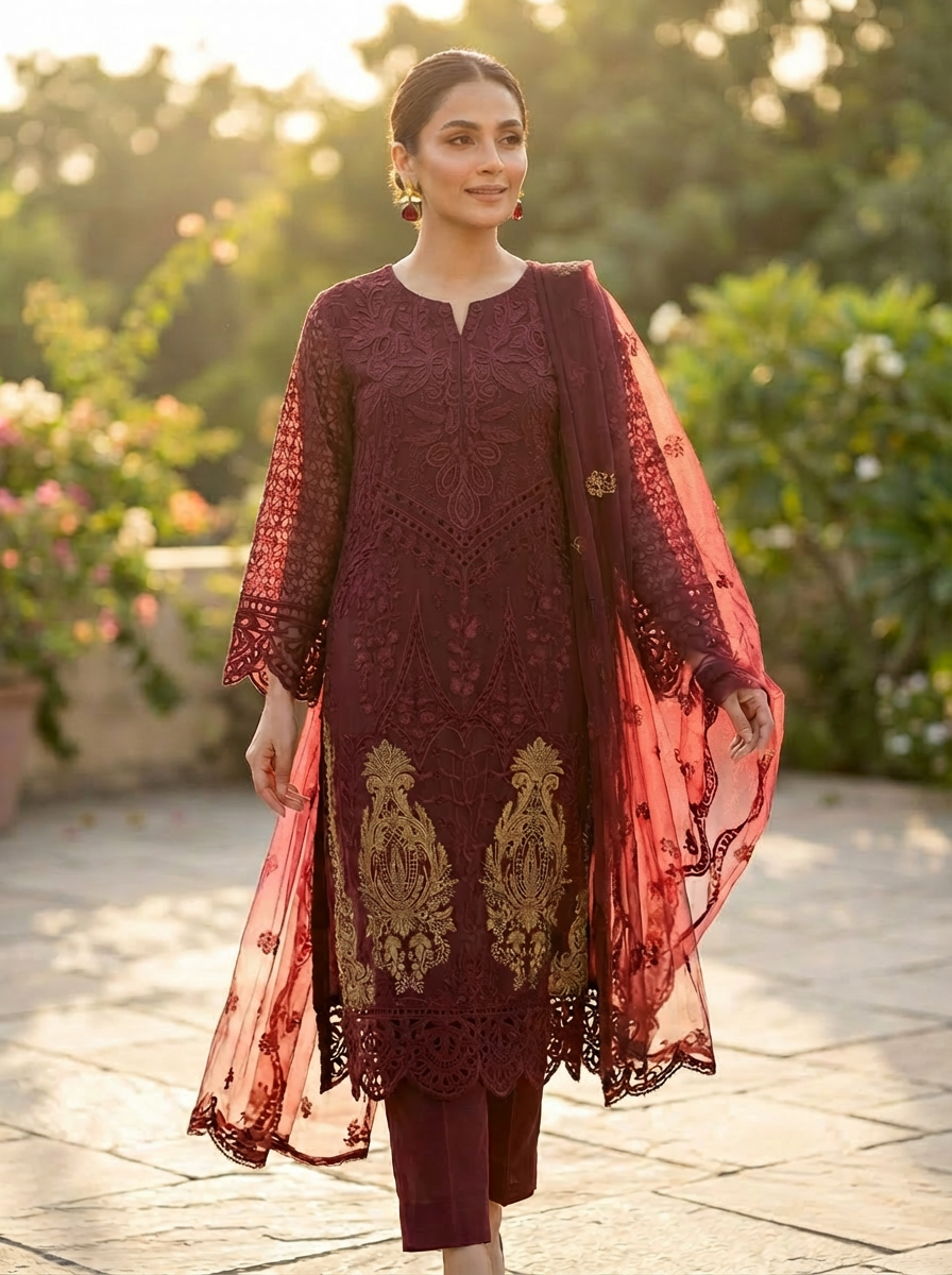 The lightweight feel and detailed machine work make this outfit perfect for formal occasions, festive wear, and evening gatherings.
