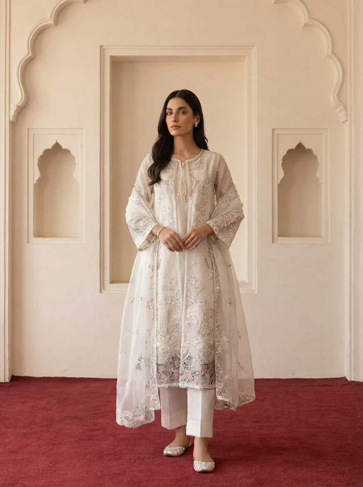 This elegant outfit is crafted from premium organza fabric, known for its sheer texture and graceful structure. The shirt is beautifully enhanced with intricate machine embroidery work, giving it a refined and luxurious appearance while maintaining a lightweight feel.