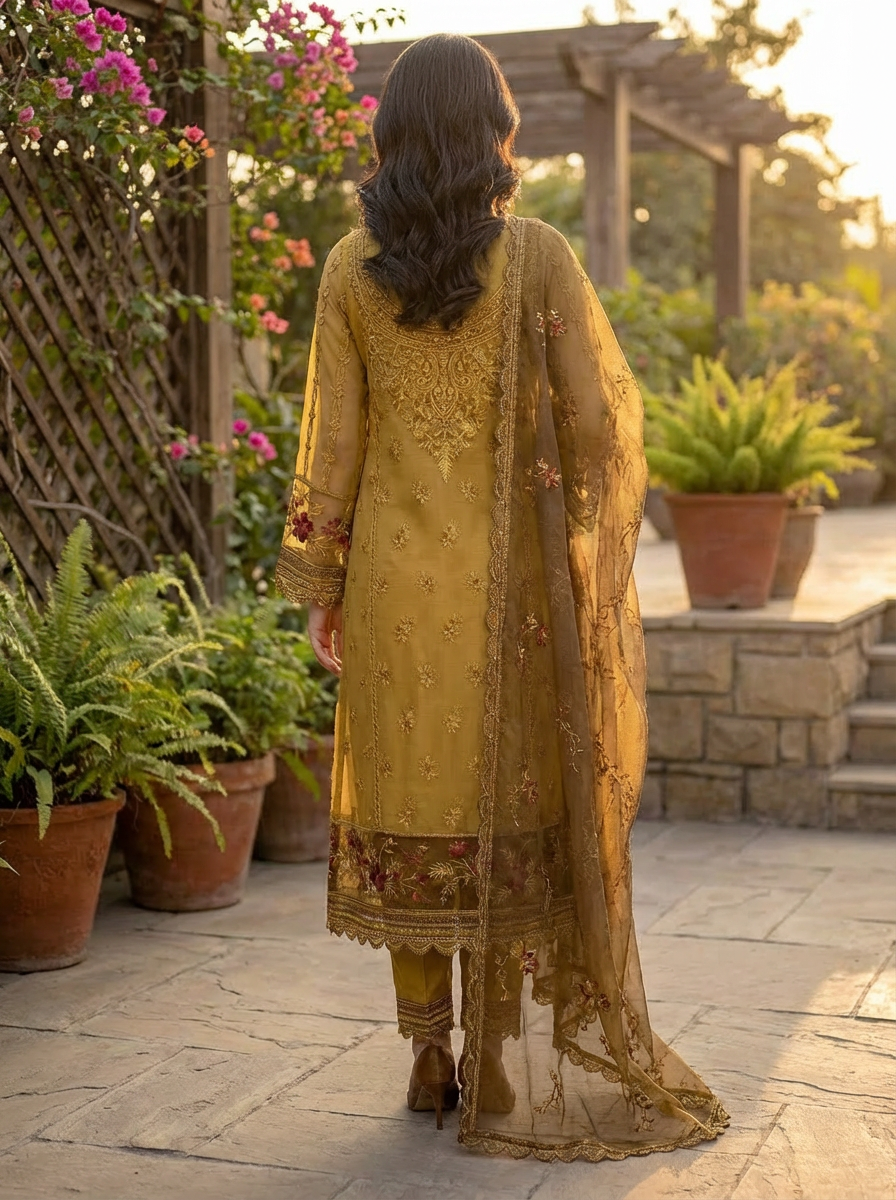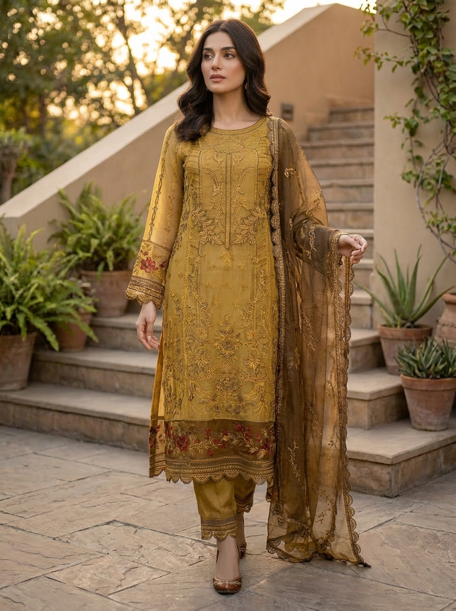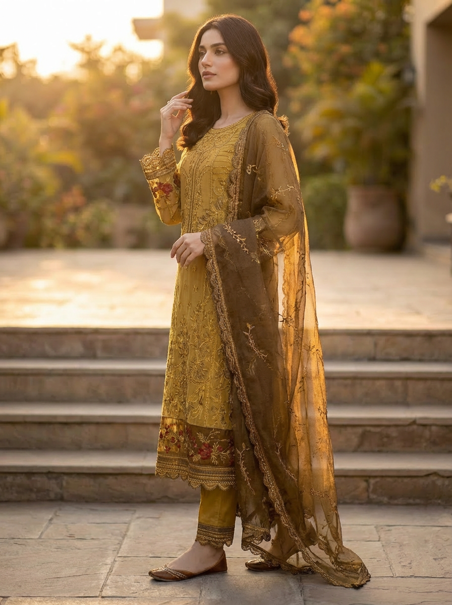 The lightweight feel and detailed machine work make this outfit perfect for formal occasions, festive wear, and evening gatherings.
