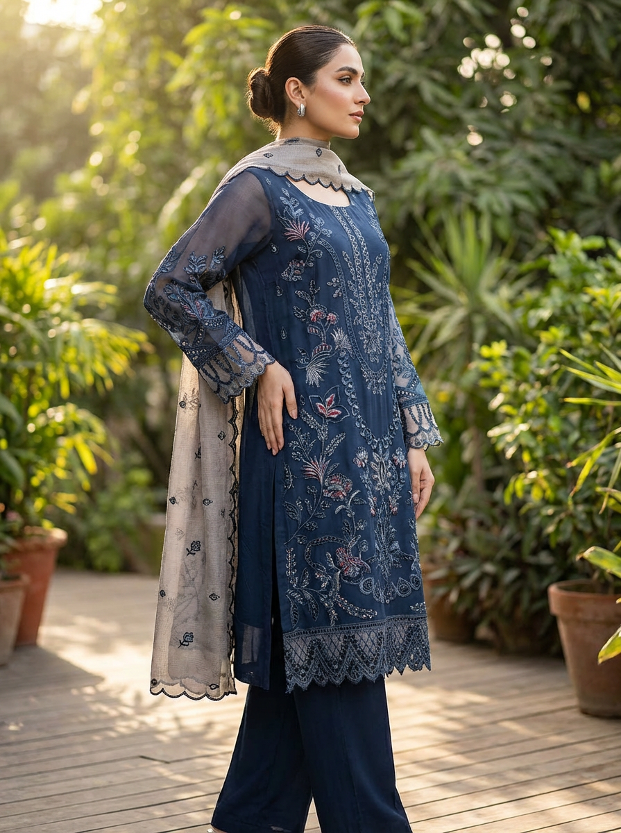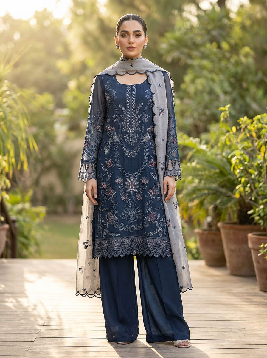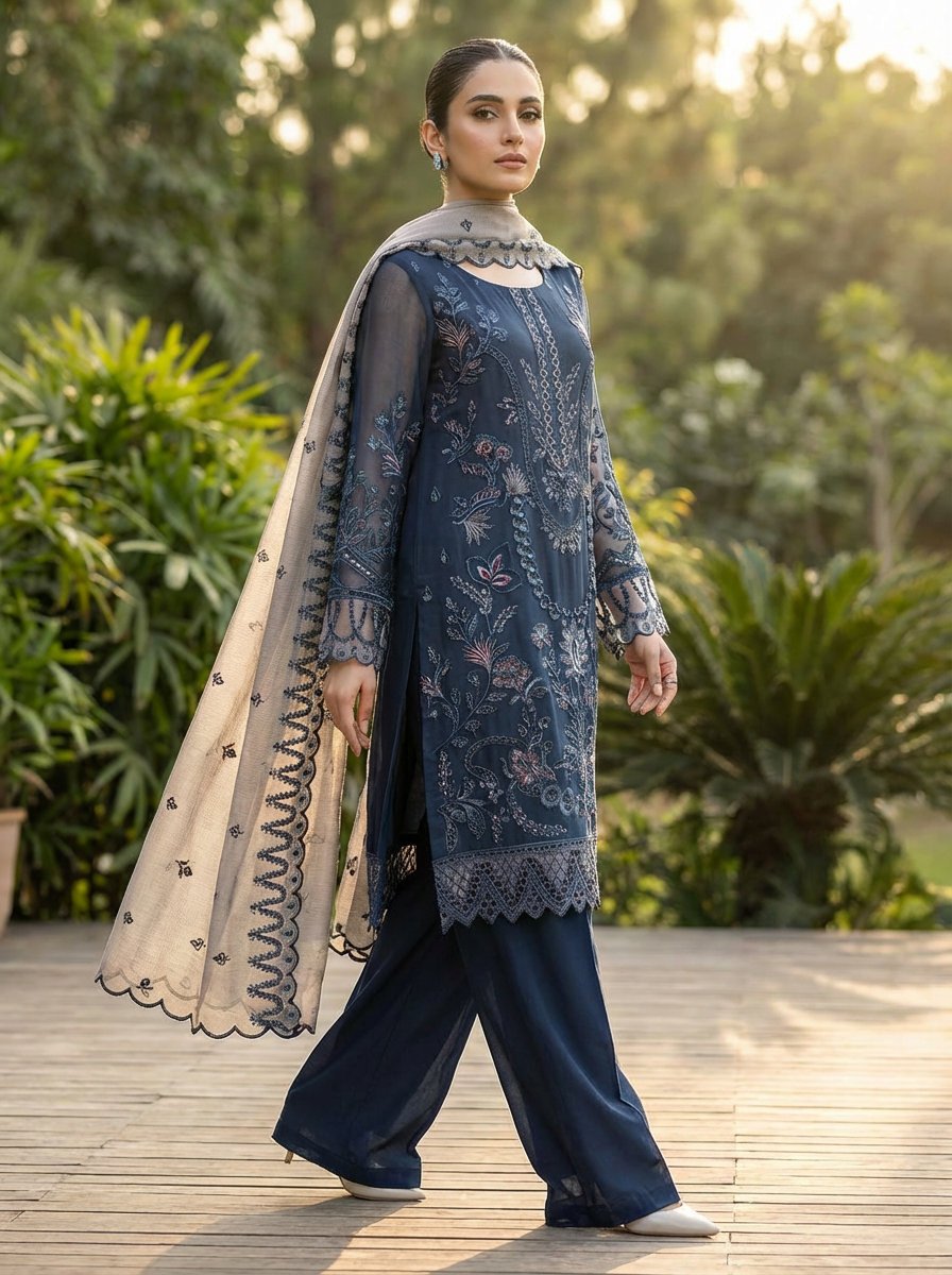 This outfit is crafted from lightweight chiffon fabric, offering a soft texture and elegant drape. The design is enhanced with fine machine embroidery work, giving it a neat and graceful finish while keeping the outfit comfortable and easy to wear.