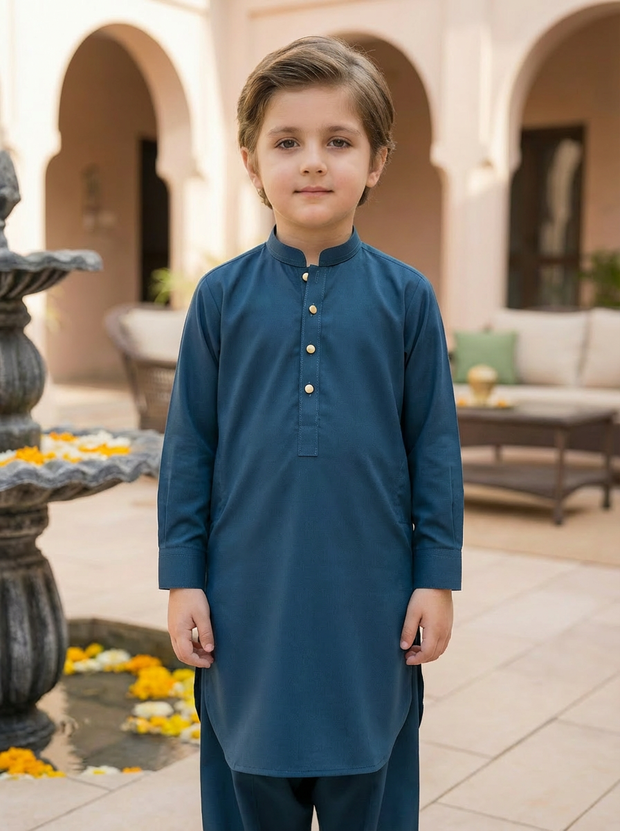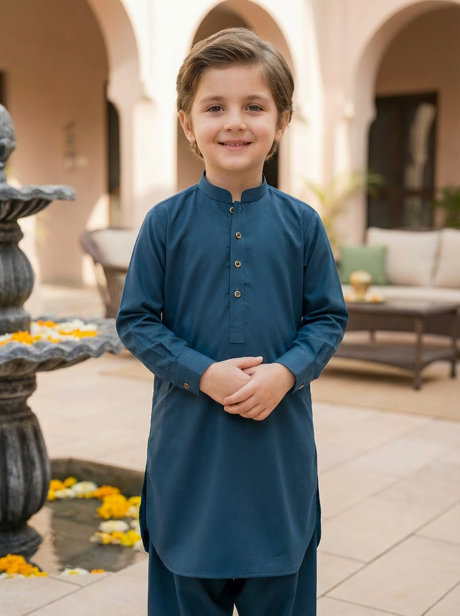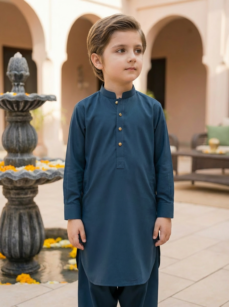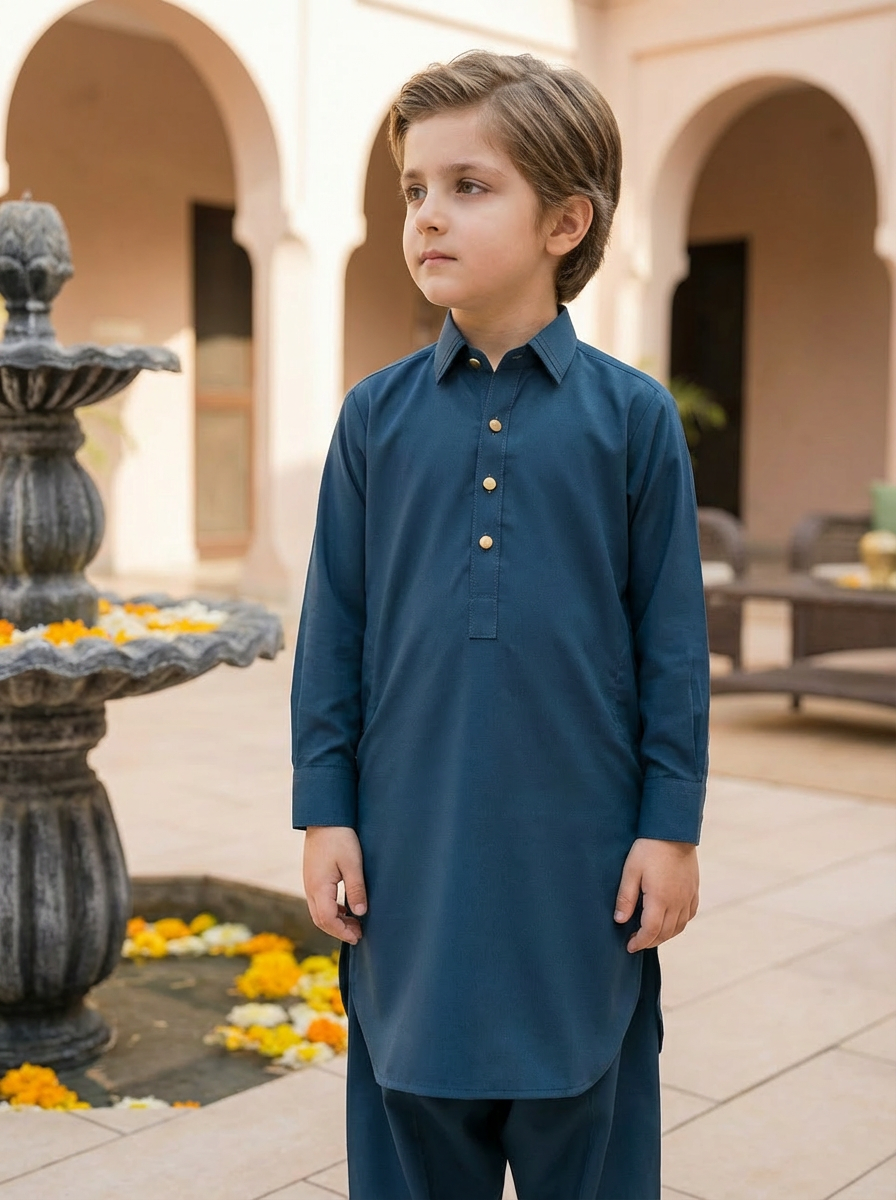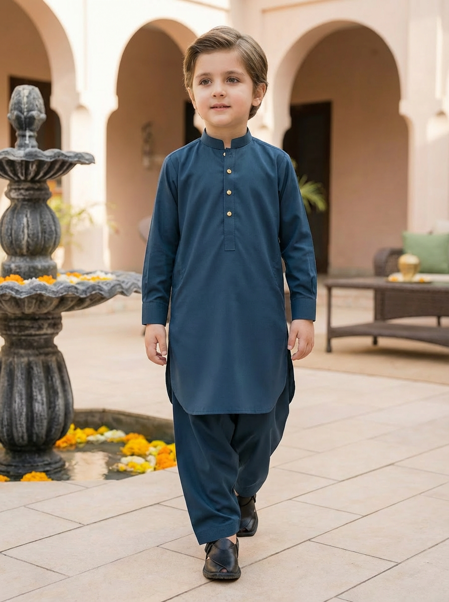 Dress your little one in timeless elegance with this classic blue kurta shalwar set. Crafted from soft, breathable fabric, this outfit ensures all-day comfort while maintaining a refined traditional look. The kurta features a neat band collar with a buttoned placket, giving it a modern yet cultural appeal. Paired with a matching shalwar, it offers ease of movement—perfect for active kids.