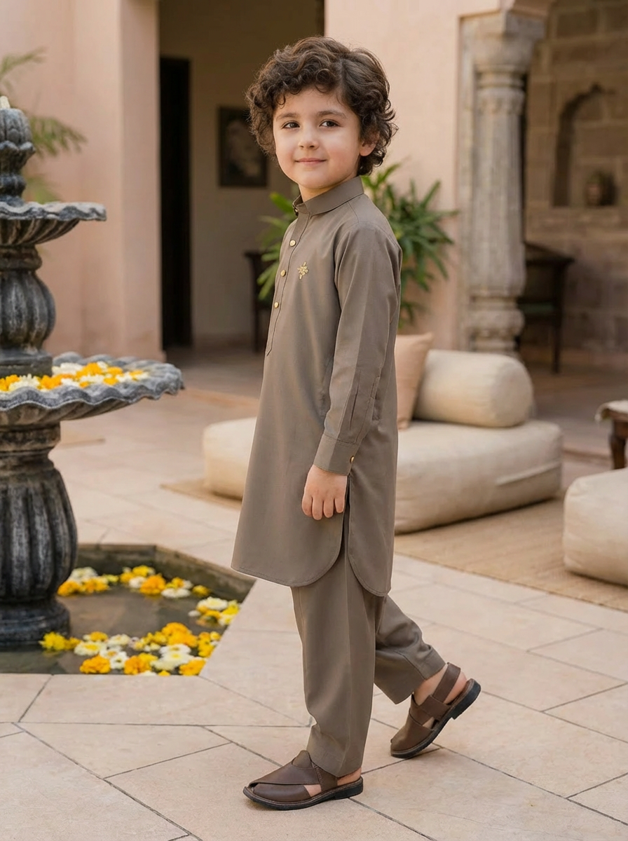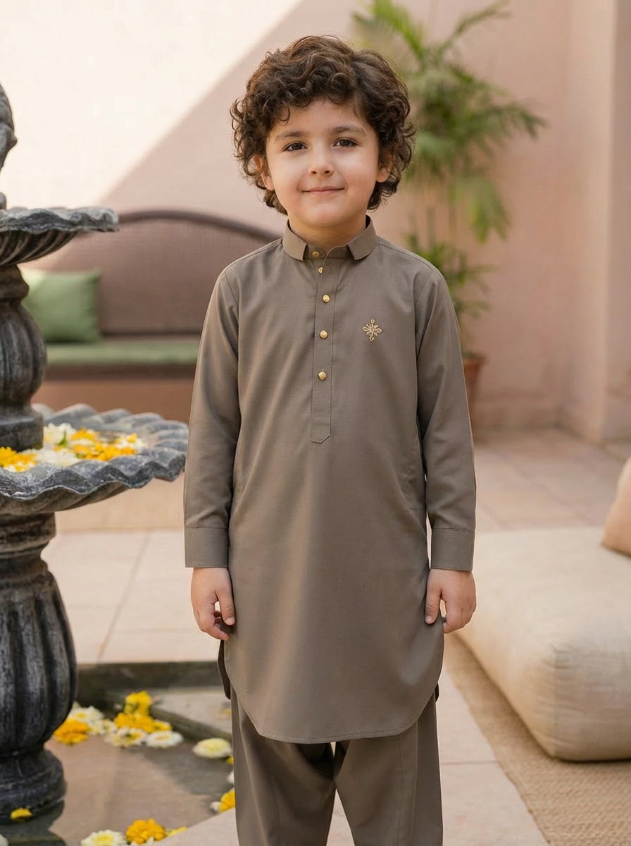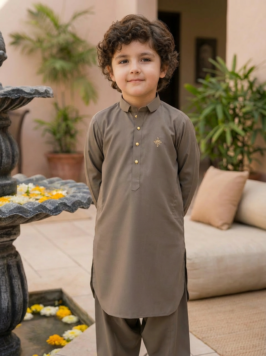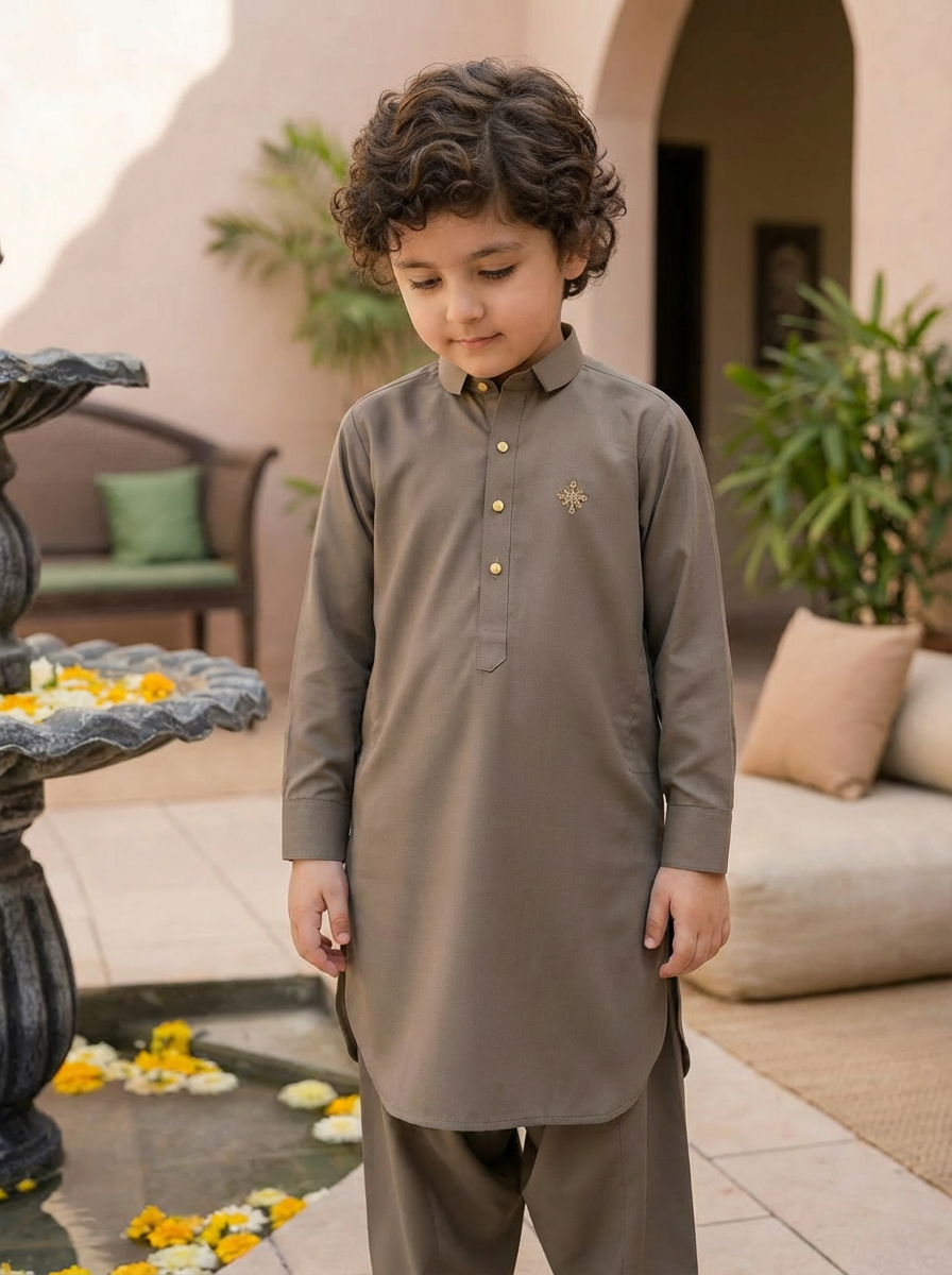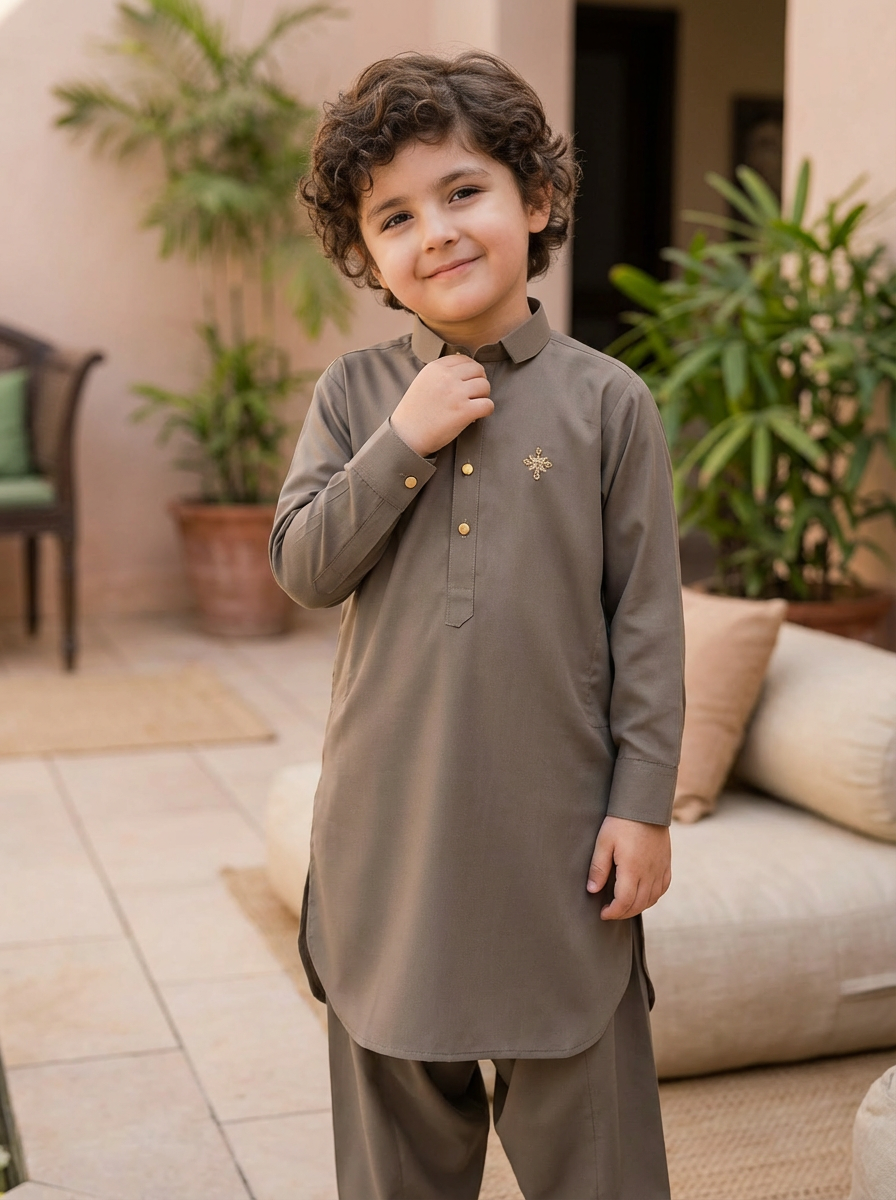 Add a touch of understated elegance to your child’s traditional wardrobe with this premium taupe kurta shalwar set. Designed with a soft, earthy tone, this outfit reflects sophistication and charm while remaining perfectly comfortable for all-day wear. The kurta features a neat band collar with refined golden buttons and a subtle embroidered emblem on the chest, adding a luxurious finishing touch without being overpowering.