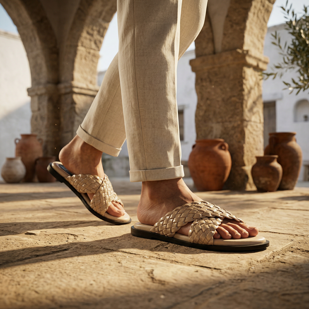 Handmade leather slippers crafted with premium leather upper material and soft leather inner lining for superior comfort. The durable sheet outsole provides stability and long-lasting wear. Featuring a stylish woven leather design, these lightweight slip-ons are perfect for casual wear and everyday use.