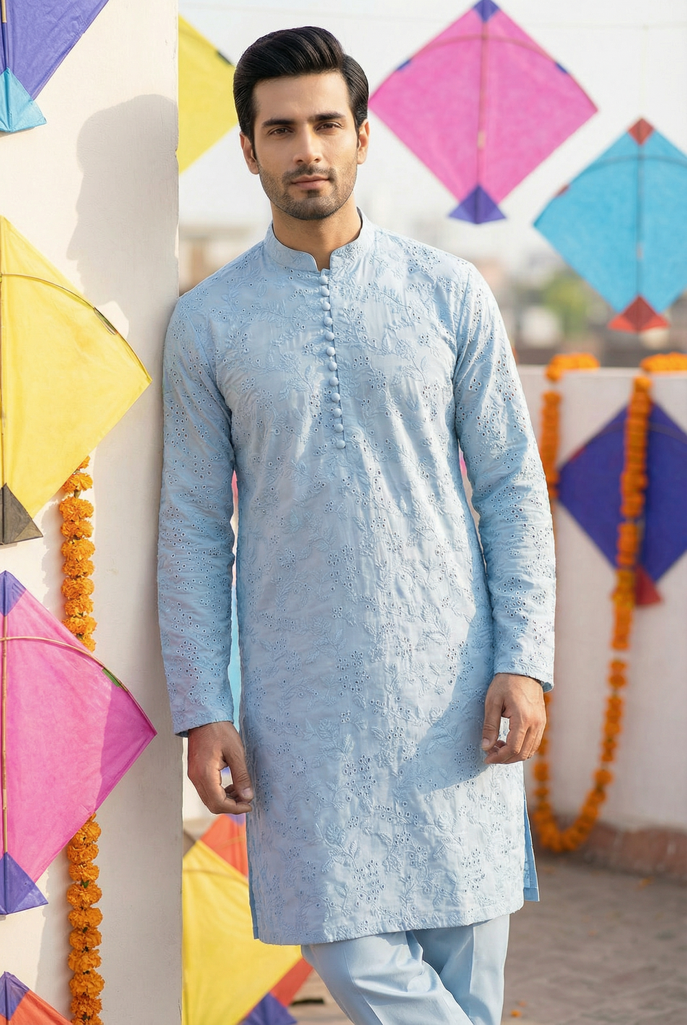 Refresh your festive wardrobe with this Luxury Embroidered Men’s Kurta, designed in a soothing sky blue base with delicate ice blue undertones that add depth and elegance. The refined all-over embroidery creates a graceful texture, giving the kurta a polished yet lightweight feel.