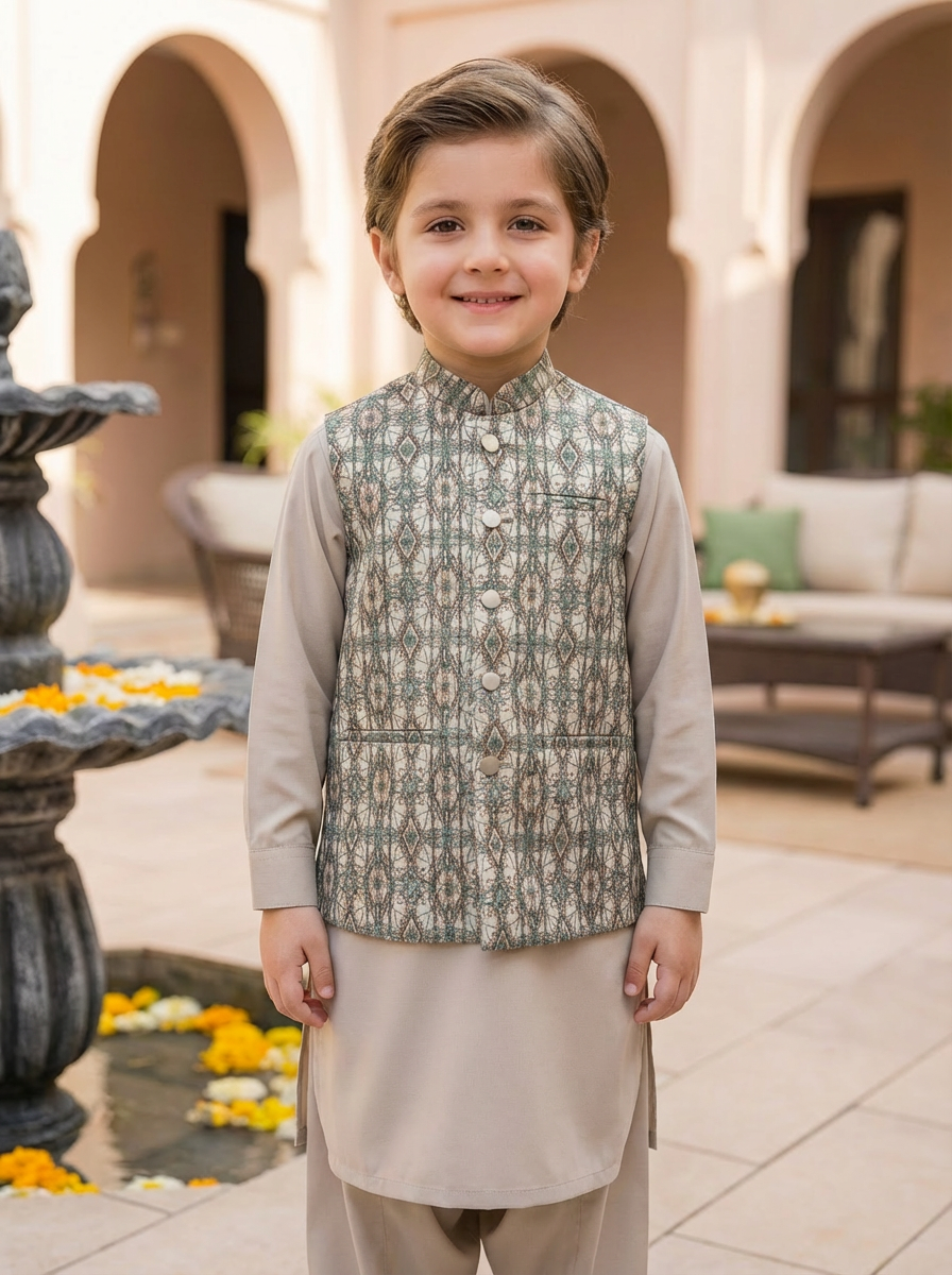 Introduce refined charm to your child’s festive wardrobe with this elegant green patterned waistcoat kurta shalwar set. Designed with a soft neutral base, the outfit is elevated by a beautifully crafted waistcoat featuring an intricate geometric pattern in subtle green and beige tones. The balanced color palette gives this ensemble a graceful, sophisticated look—perfect for special occasions.