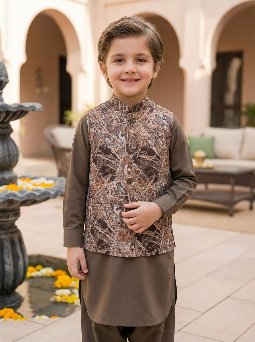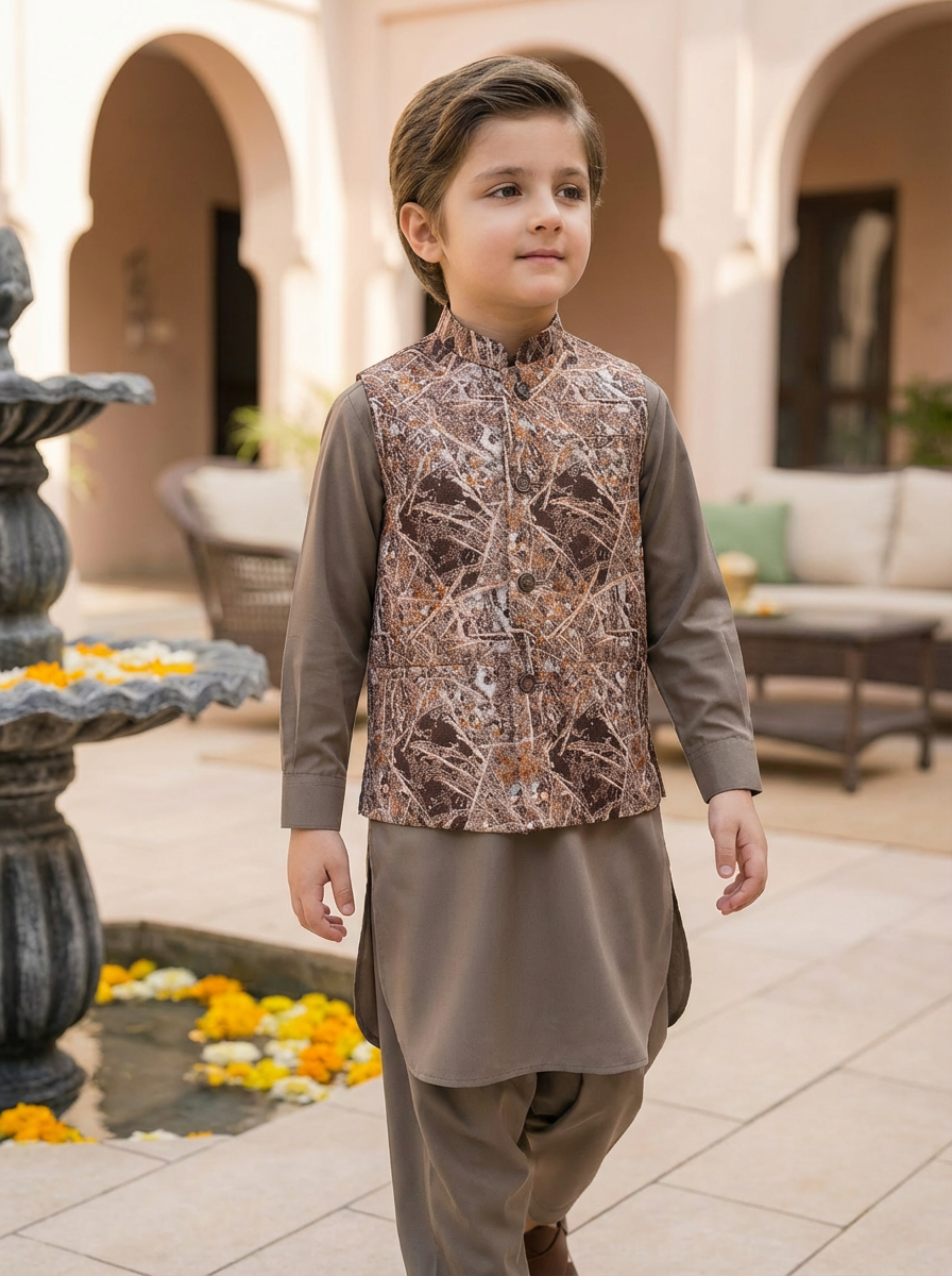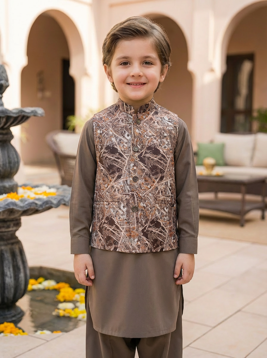 Elevate your child’s festive look with this uniquely designed brown abstract pattern waistcoat kurta shalwar set. Blending modern artistry with traditional elegance, this ensemble features a rich brown kurta shalwar paired with a statement waistcoat showcasing an intricate abstract branch-inspired pattern in earthy tones. The design adds depth and character while maintaining a refined, graceful appearance.