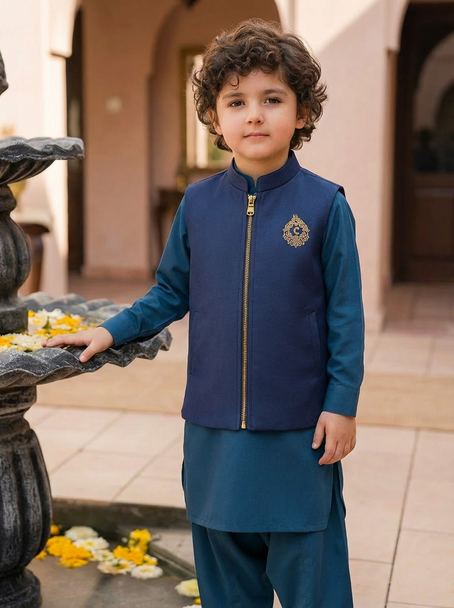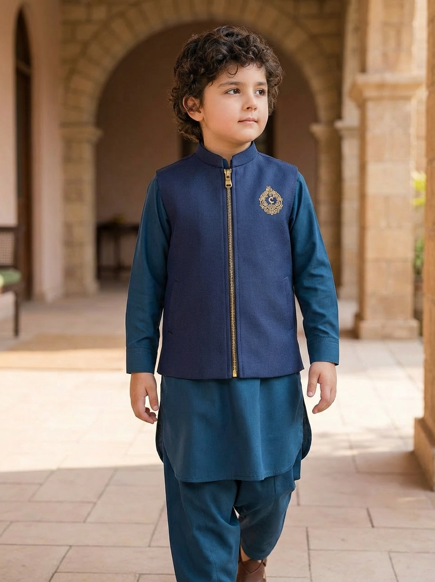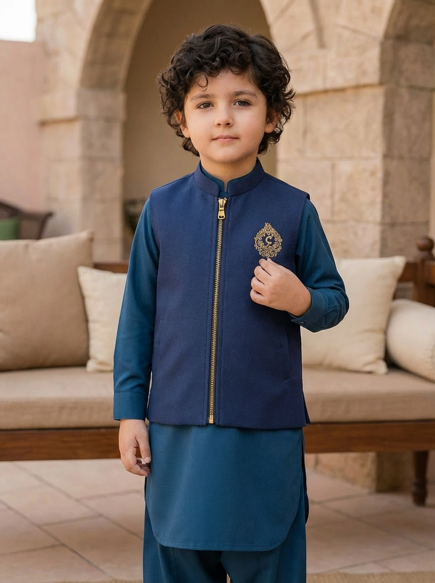 Give your child a refined and stylish festive look with this navy blue waistcoat kurta shalwar set. Designed to blend tradition with modern elegance, this outfit features a rich navy waistcoat with a smooth front zip closure and a subtle gold crest emblem on the chest, adding a touch of luxury and distinction. The matching kurta shalwar in a coordinated blue tone completes the look with a clean, polished finish.