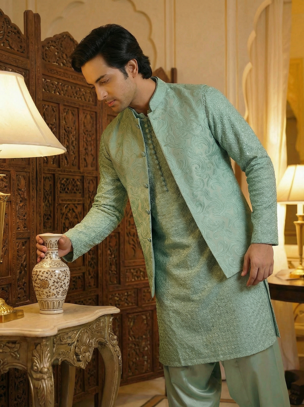 Refined and regal, this Luxury Embroidered Men’s Waistcoat is crafted in a rich olive green base, beautifully complemented by soft mint undertones that add depth and elegance to the overall look. The intricate embroidery and subtle sequin detailing create a sophisticated texture, making this waistcoat a standout piece for formal traditional wear.