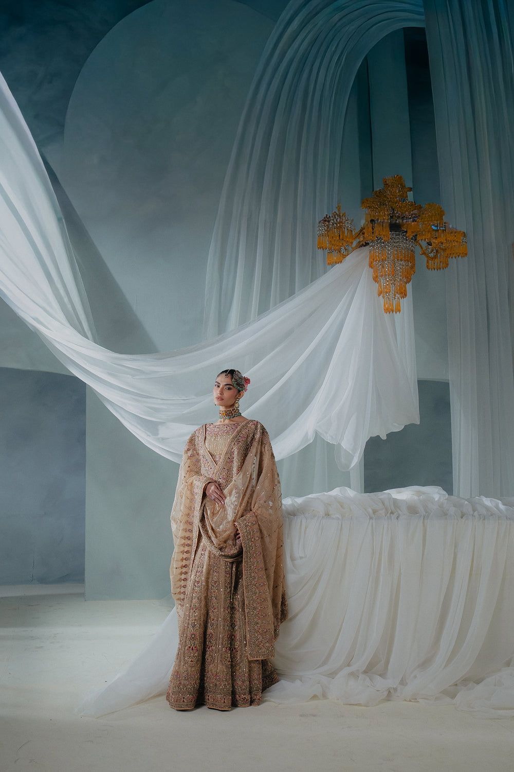 This breathtaking bridal ensemble is crafted from luxurious organza fabric in a radiant golden hue, creating a look that is both regal and timeless. Every inch of the outfit is entirely handmade, featuring intricate embroidery, delicate beadwork, and artistic detailing that highlight exceptional craftsmanship.