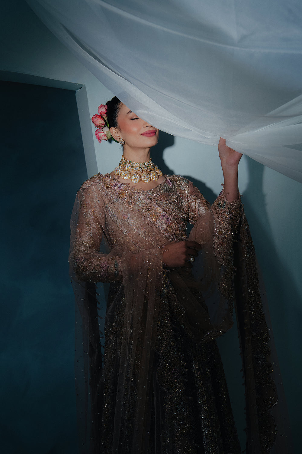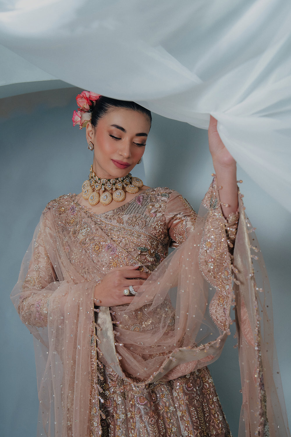 The fabric of the outfit is tissue, while the dupatta is made of net. The entire ensemble is fully handmade, and it comes in a beautiful coffee-pink color.